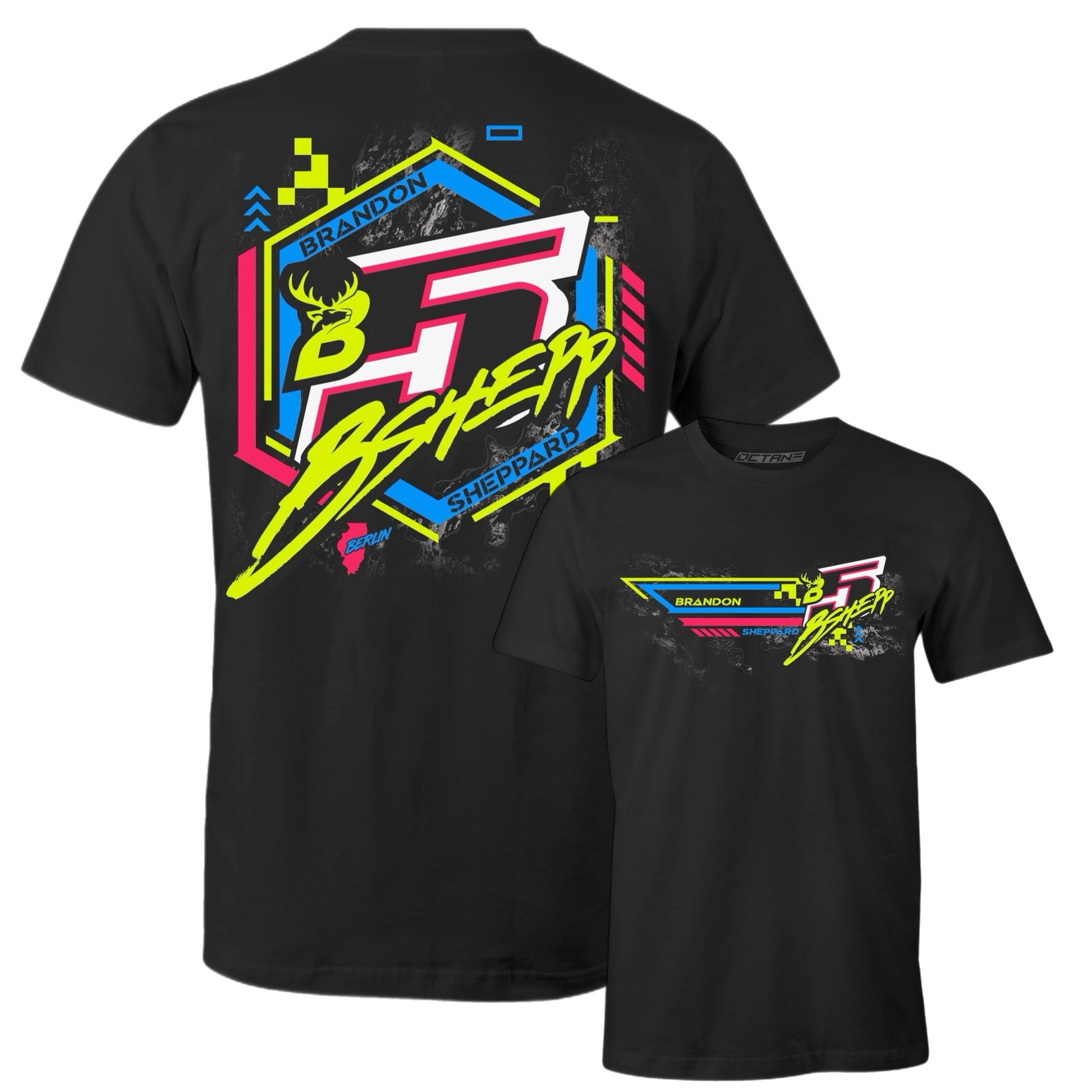 💥 Back: Oversized “BSHEPP” hex design with neon detailing